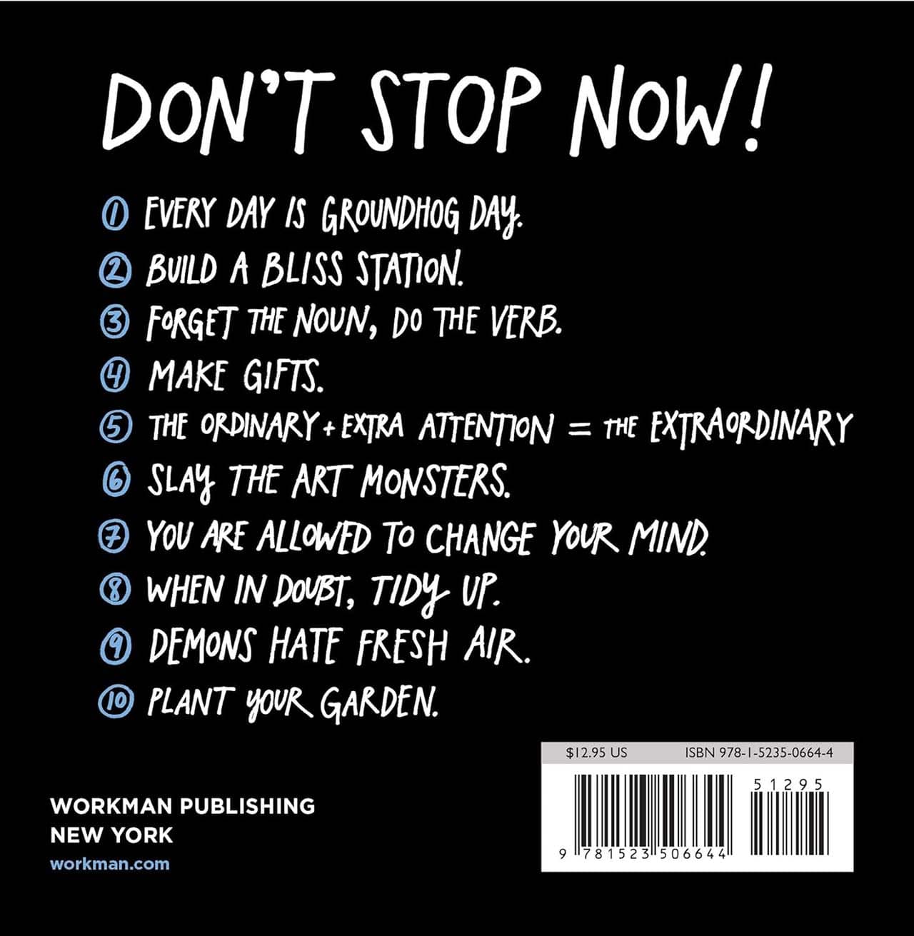The creative life is not a linear journey to a finish line, it’s a loop—so find a daily routine, because today is the only day that matters. Disconnect from the world to connect with yourself—sometimes you just have to switch into airplane mode. Keep Going celebrates getting outdoors and taking a walk (as director Ingmar Bergman told his daughter, ”The demons hate fresh air”). Pay attention, and especially pay attention to what you pay attention to. Worry less about getting things done, and more about the worth of what you’re doing. Instead of focusing on making your mark, work to leave things better than you found them.