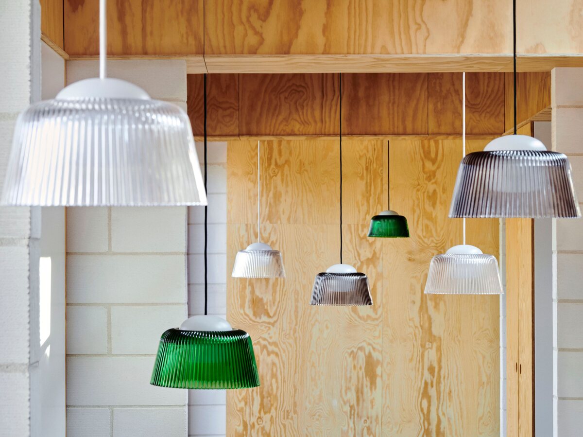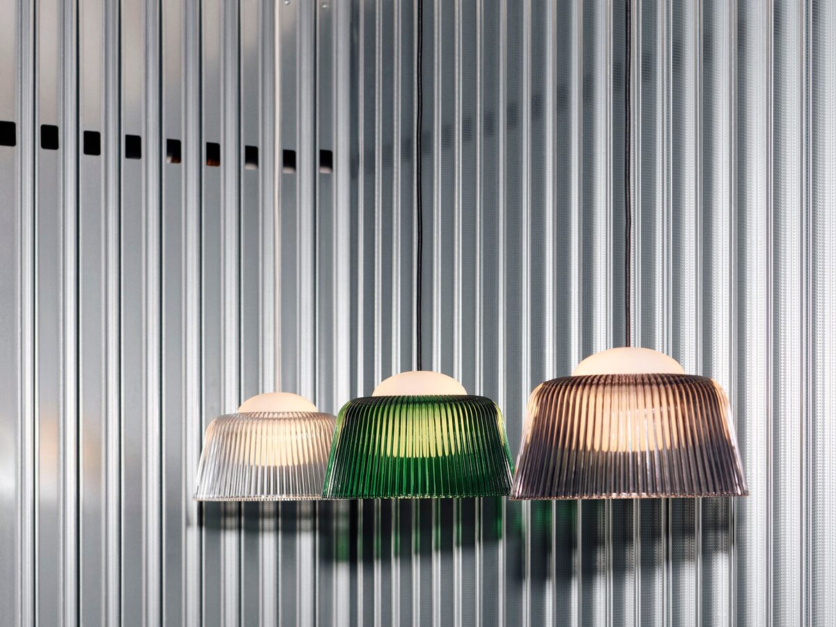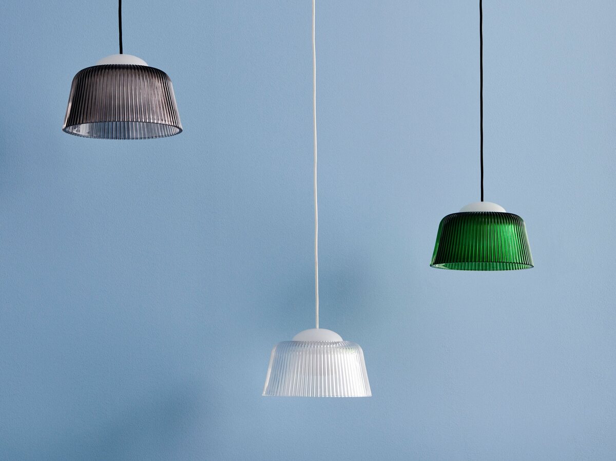 The Brim Pendant Lamp by HAY features a fluted pressed glass shade that enhances light diffusion. Designed by Naoto Fukasawa, its compact size makes it ideal for hanging in clusters or individually in smaller spaces.