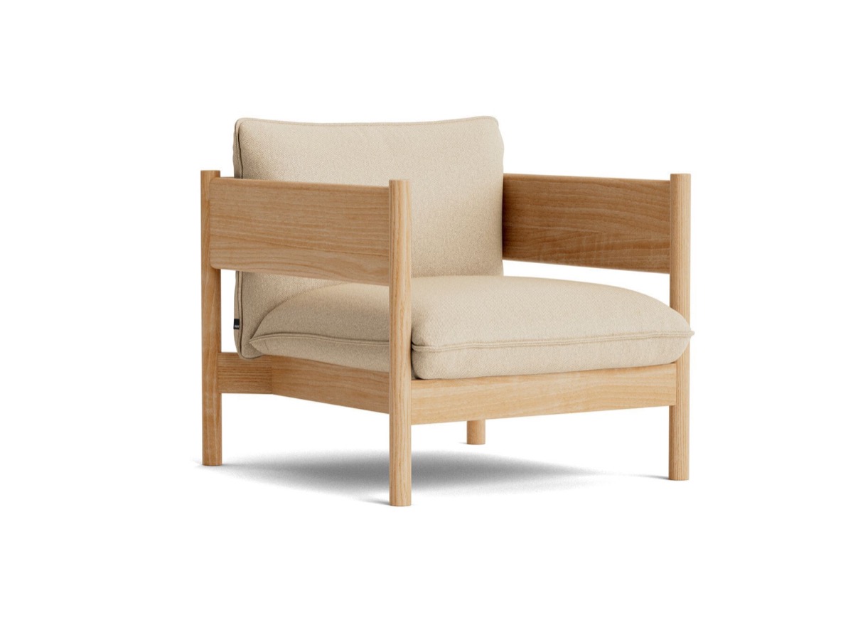 The Compact Club Armchair by HAY is constructed from FSC-certified solid wood and plywood, featuring a water-based lacquered frame and EU-Ecolabelled upholstery. Its seat and back cushions are made from recycled materials, offering both comfort and durability.