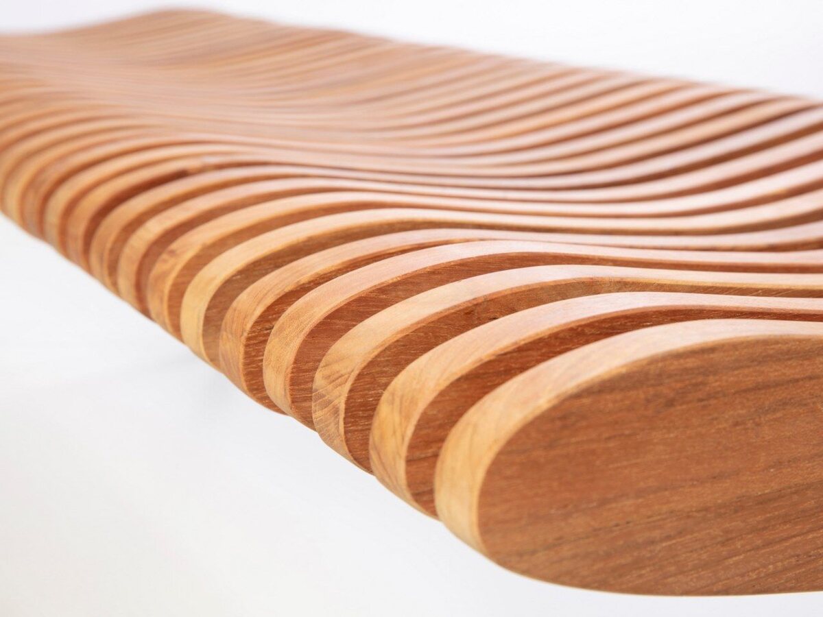 Designed by Caroline Voet for PER/USE, the Teak Slatted Garden Bench combines a stainless-steel base with flowing and elegant wooden parts, creating an unexpected visual effect. Despite its striking appearance, it maintains comfortable and ergonomic qualities. This bench serves as an inspiring design object suitable for homes, business locations, or public spaces.