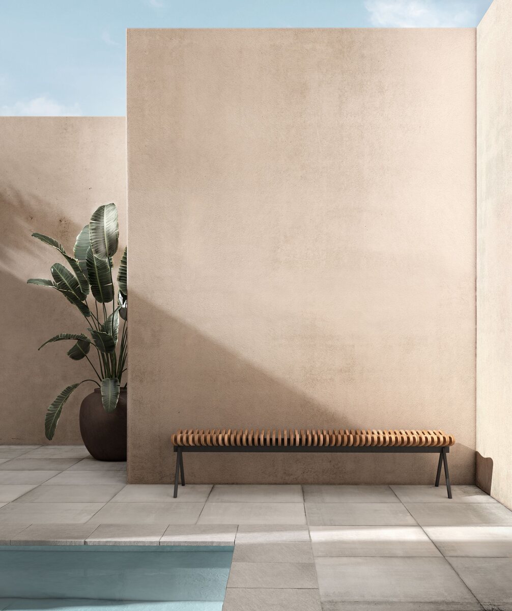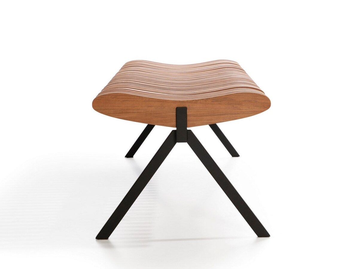 A contemporary teak garden bench with a slatted seat and black powder-coated steel legs, designed by Caroline Voet.